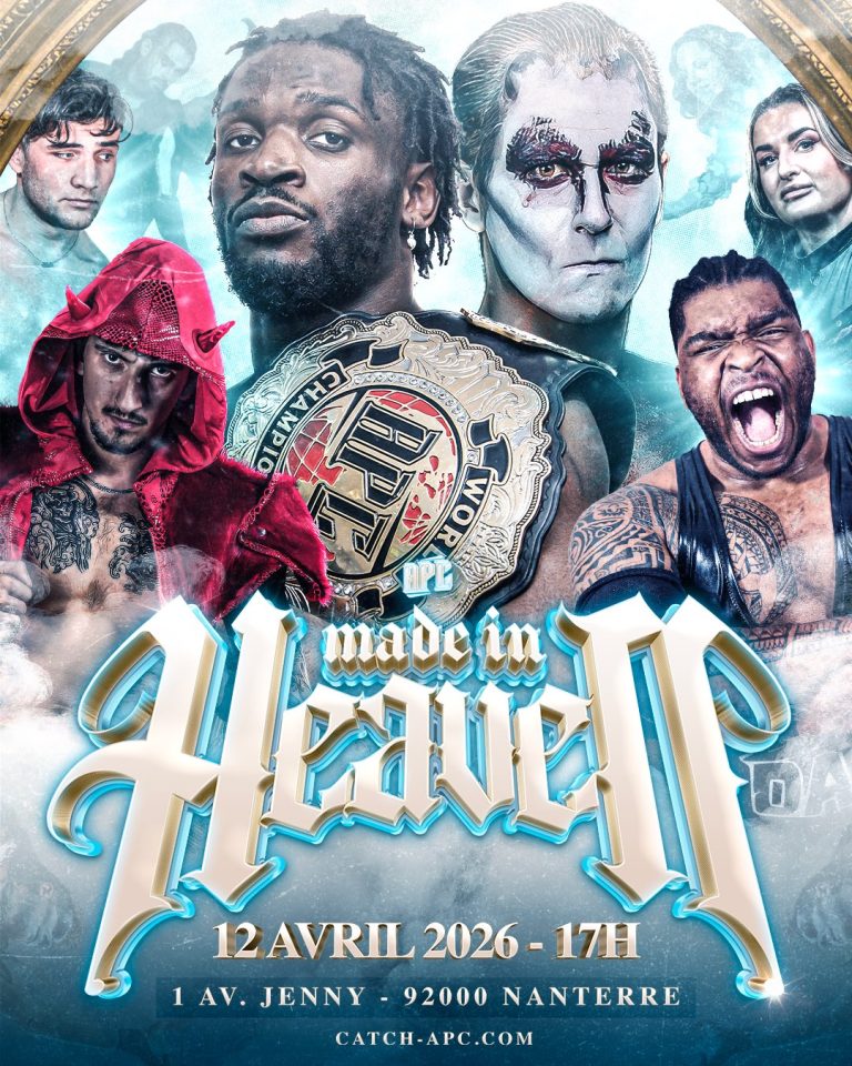 Le dimanche 12 avril 2026 à 17h00, le Studio Jenny à Nanterre accueillera un nouvel événement exceptionnel de l’APC Catch : “Made In Heaven”. Dans l’ambiance unique du Temple du catch français, ce show promet une soirée intense mêlant spectacle, adrénaline et émotions fortes.
